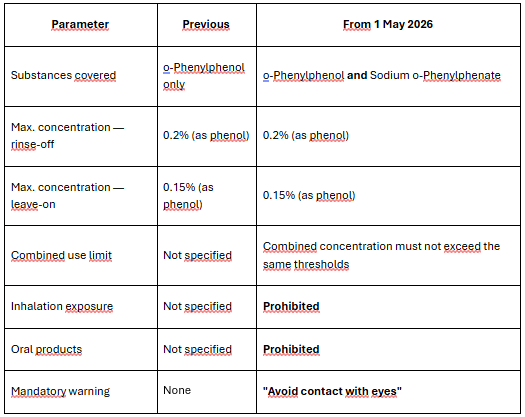The prohibition of o-Phenylphenol in applications with inhalation exposure is new. Spray, mist, and aerosol formats using this preservative require immediate reformulation assessment.