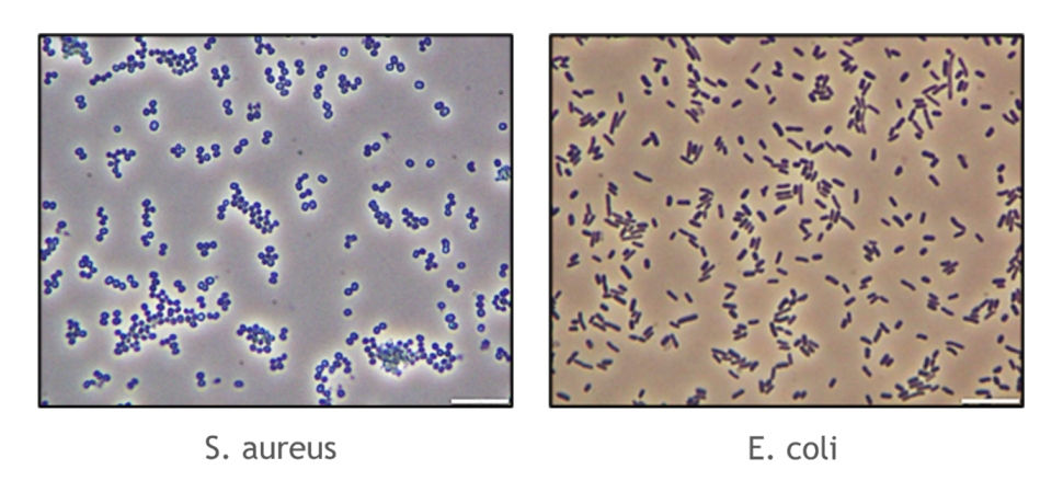 To complete an identification process, the use of the microscope can permit to have different shapes of bacteria called cocci or bacilli and different colors : pink or violet which are obtained after a Gram coloration treatment. For example, here we have a cocci Gram + which is S. aureus and a bacilli Gram – which is E. coli.