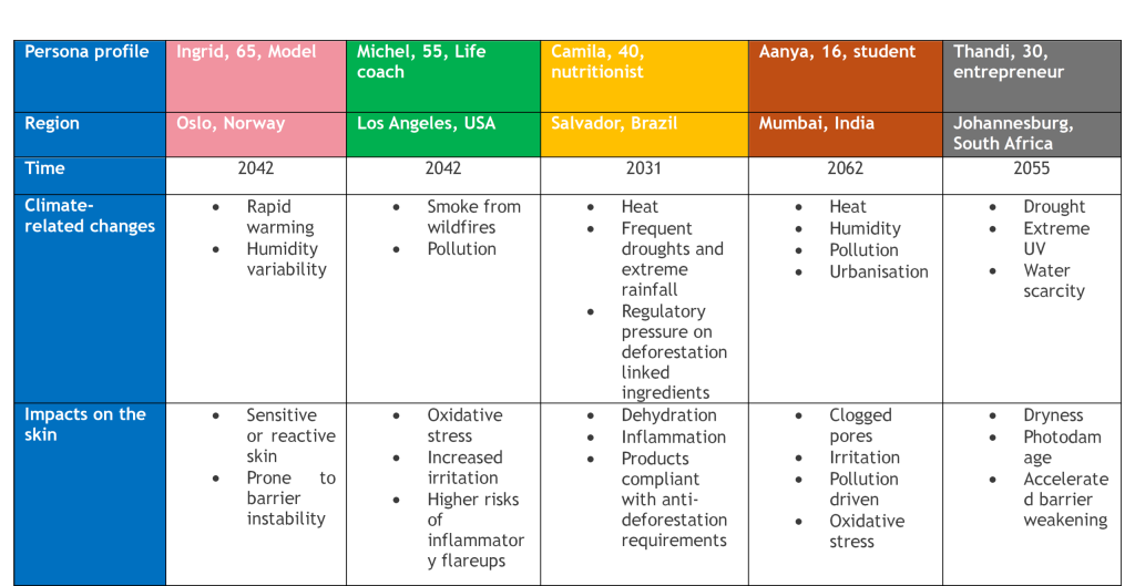 Solène: Our beauty personas were defined by combining global climate science with emerging consumer insights, ensuring each persona reflects both future environmental conditions and evolving beauty expectations.