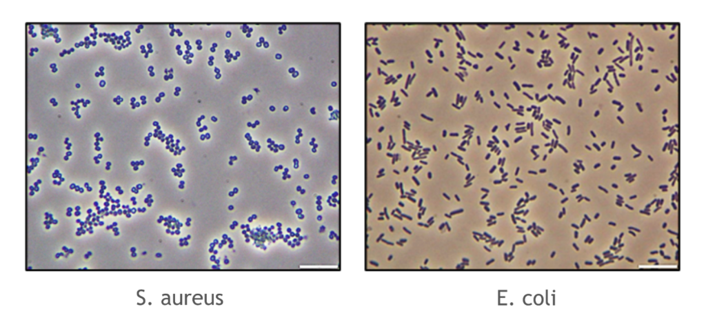 Pour compléter l’identification, l’utilisation du microscope permet d’observer différentes formes de bactéries : les coques (cocci) ou les bâtonnets (bacilles), ainsi que différentes couleurs (rose ou violet) obtenues après une coloration de Gram. Par exemple, nous avons ci-dessous un cocci Gram + (S. aureus) et un bacille Gram – (E. coli).