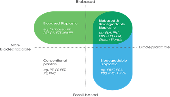 - Les plastiques conventionnels (issus de la pétrochimie) biodégradables qui peuvent être totalement décomposés par des processus de décomposition microbiens ou enzymatiques, comme le polybutylène adipate téréphtalate (PBAT) et le polycaprolactone (PCL).
